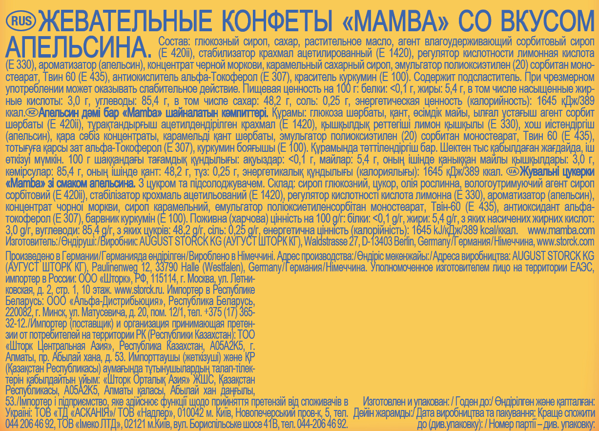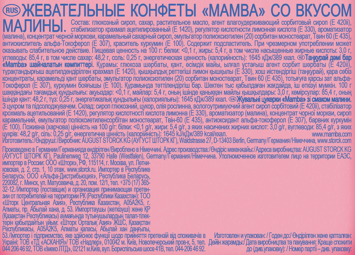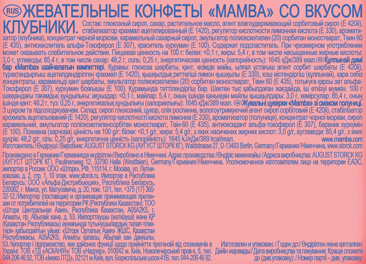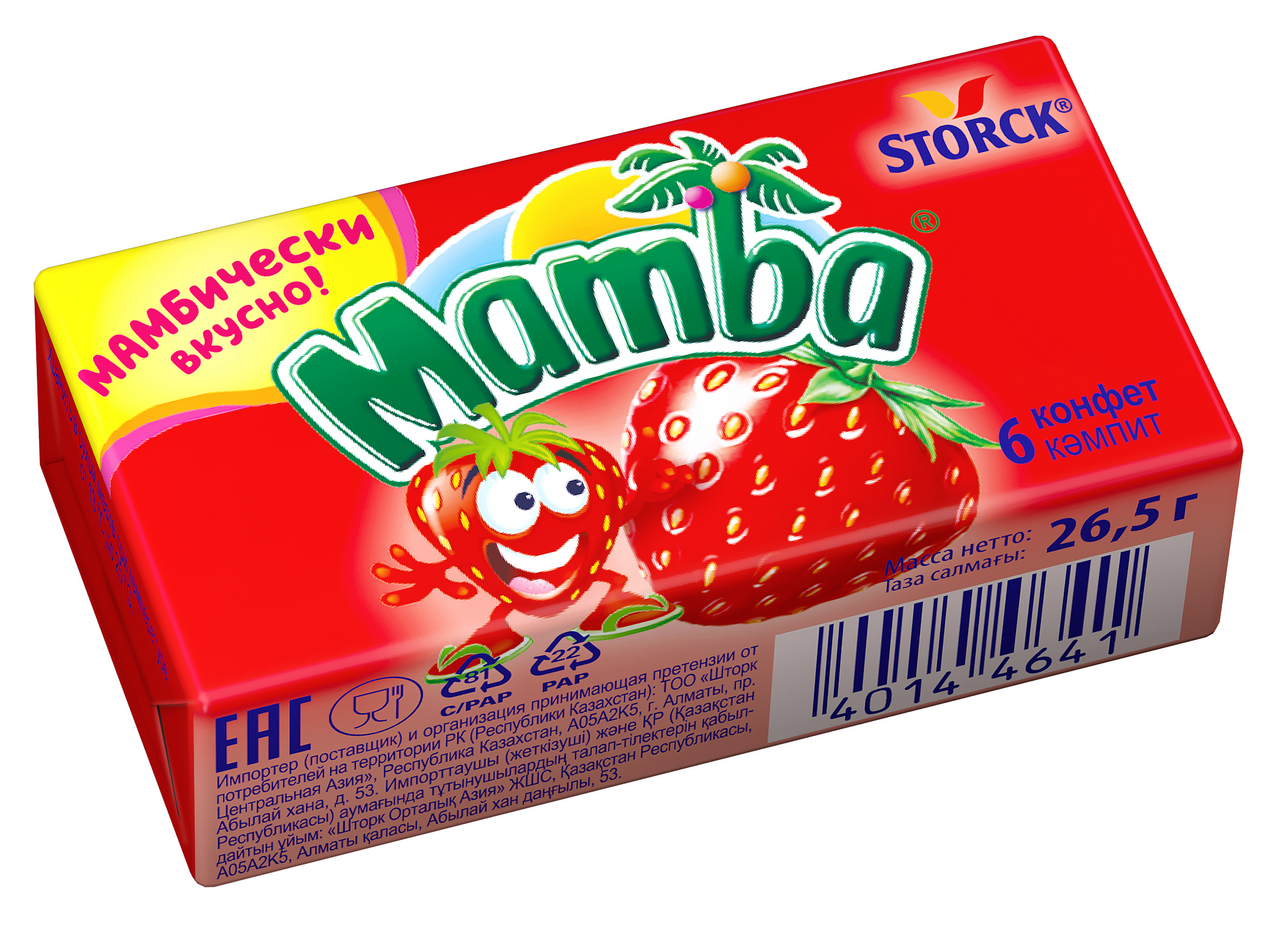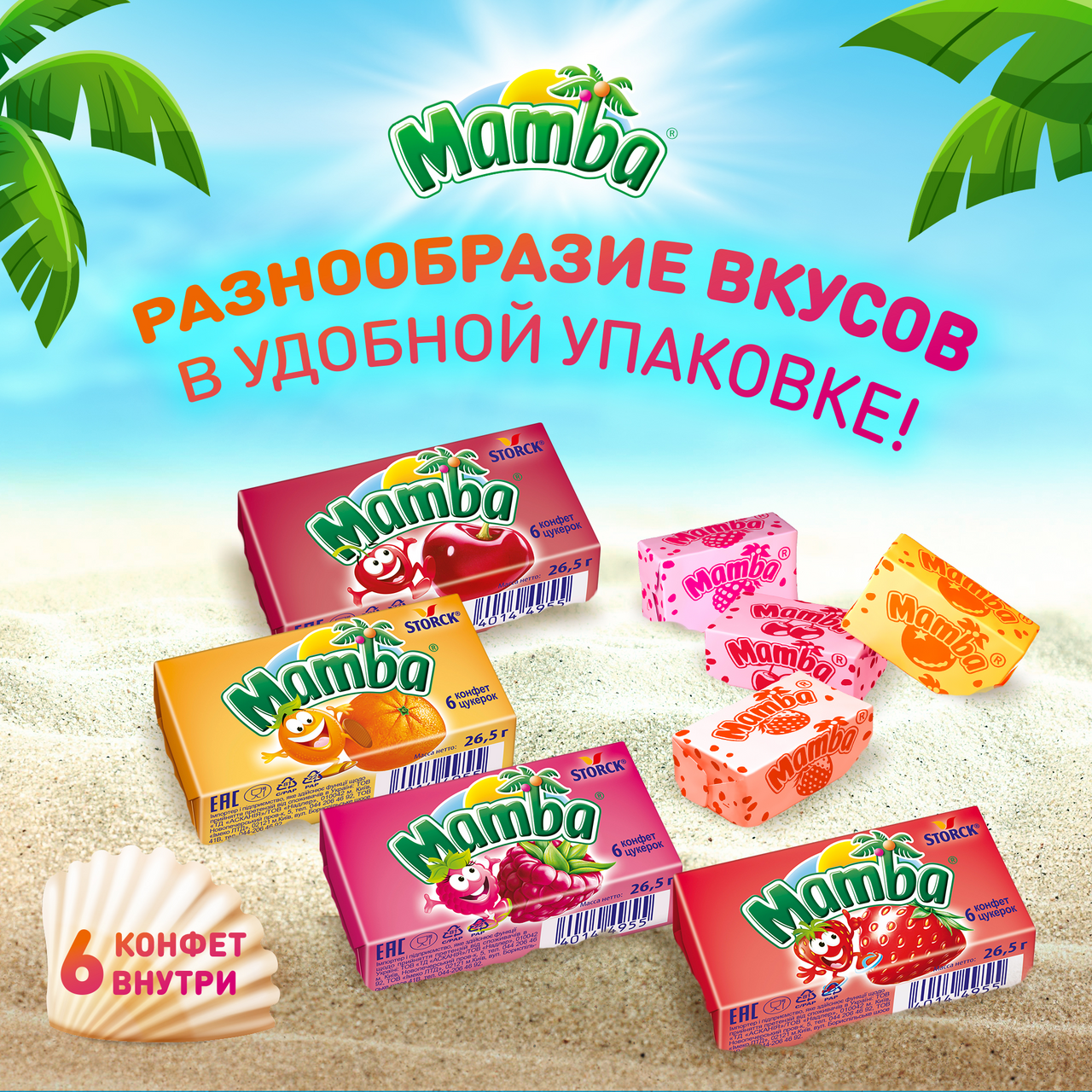 Mamba - это сочные жевательные конфеты с различными вкусами, которые пользуются популярностью среди детей и взрослых! Конфеты Mamba представлены в удобной упаковке, которую так легко взять с собой и поделиться с друзьями. Мамba - жевательные конфеты со вкусами клубники, малины, апельсина, колы или вишни! Каждая упаковка состоит из шести жевательных конфет в индивидуальной обертке. В большой упаковке вы найдете ассорти вкусов, чтобы поделиться с друзьями.