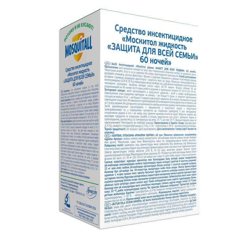 Средство от насекомых Mosquitall от комаров для всей семьи 60 ночей 30 мл. Как же защитить себя и свою семью от надоедливых комаров, мух, клещей и прочих вредителей? Средства для борьбы с опасными насекомыми должны быть не только мощными и эффективными, но и безопасными для самого человека. Mosquitall уже более 15 лет помогает справиться с этой задачей, предлагая инновационные продукты и стоит на страже Вашего здоровья, покоя и хорошего настроения! Mosquitall 'Защита для взрослых' — специализированная группа товаров, объединяющая в своем ассортименте средства уничтожения (инсектициды) и защиты (репелленты) от кровососущих насекомых. Разработана для людей, предпочитающих цивилизованный семейный отдых на природе или дома, для которого необходимо профессиональные эффективные и безопасные средства защиты от насекомых. Жидкость быстро и надежно уничтожает комаров и других летающих кровососущих насекомых внутри помещения. Жидкость воздействует на насекомых уже через 5 минут после включения электрофумигатора.