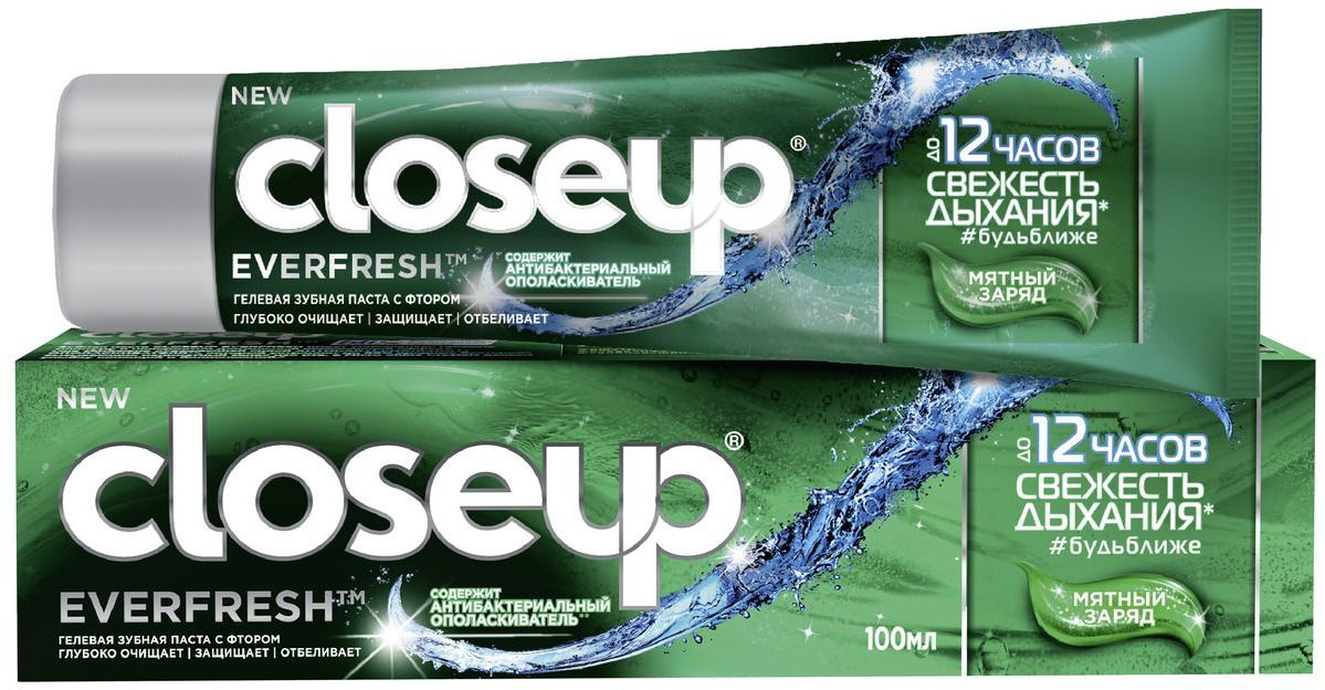 Будьте готовы быть ближе с новой гелевой зубной пастой CLOSEUP EVERFRESH!Зубная паста обеспечивает невероятно длительный освежающий эффект: свежесть дыхания до 12 часов*, чтобы в моменты близости вы всегда чувствовали себя уверенно!Зубная паста заряжена освежающей силой антибактериального ополаскивателя**, который устраняет до 99% вредных бактерий’, вызывающих неприятный запах изо рта, что позволяет надолго сохранить дыхание свежим. Освежающий эффект зубной пасты подтвержден клиническими исследованиями.Зубная паста CLOSEUP EVERFRESH мятный заряд имеет уникальную'' гелевую текстуру насыщенного зеленого цвета с перламутровыми частичками.Зубная паста обладает ярким освежающим вкусом мяты.Гелевая зубная паста CLOSEUP EVERFRESH содержит фтор для эффективной защиты от кариеса и защиты всей полости рта. Кроме того, она бережно и тщательно очищает эмаль за счет абразива - диоксида кремния (Silica). Диоксид кремния имеет округлую форму частиц и не травмирует эмаль в процессе чистки зубов, при этом позволяет добиться равномерного удаления налета по всей поверхности зубов.Зубная паста содержит специальные компоненты Micro Shine Crystals, которые способствуют отбеливанию эмали, делая вашу улыбку сияющей и белоснежной’’’.Зубная паста CLOSEUP EVERFRESH мятный заряд имеет подтверждение FDI (Международная федерация стоматологов) о том, что чистка зубов дважды в день такой зубной пастой Closeup Everfresh, улучшает состояние полости рта.*по результатам клинических исследований снижения неприятного запаха изо рта после 4 недель регулярного использования, Unilever, Индия, Китай, 2007.**на основе формулы антибактериального ополаскивателя с цинком.‘’в ассортименте Unilever.‘ин-виво исследования Unilever, Великобритания, 2011.‘’’совместно с отбеливающей формулой.
