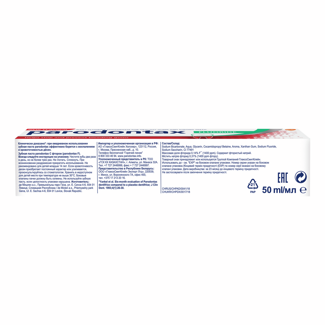 Parodontax - бренд No1 по рекомендации* стоматологов при кровоточивости десен. Зубная паста Parodontax c фтором специально разработана для устранения воспаления и кровоточивости десен, а также поддержания здоровья десен, крепости зубов и свежести дыхания. 5 причин выбрать Parodontax:- В 4 раза эффективнее устраняет зубной налет**- Предупреждает заболевания десен***- Способствует профилактике кариеса- Тщательно очищает зубы, не повреждая зубную эмаль- Быстро и эффективно снижает количество налета даже в труднодоступных местах***** Изучение рекомендаций стоматологами различных марок в сегменте по уходу за полостью рта, Институт маркетинговых исследований ГФК -Русь, ноябрь 2017 – январь 2018 г.** Удаляет больше зубного налета после чистки зубов в кабинете стоматолога с последующей чисткой зубов 2 раза в день, по сравнению с обычной зубной пастой. Обзор компании ГСК. Исследование эффективности и переносимости зубной пасты, содержащей бикарбонат натрия. 2015*** Благодаря содержанию бикарбоната натрия. При использовании 2 раза в день**** Yankel S.L. et al. J Clin Dent, 1993; 4(1)96:30; Akwagyrlam l et all. Poster 174485 presented at International Association of dental Reseash, Seattle.62 Wash, March 2013 CHRUS/CHMSM/0003/15a(1)
