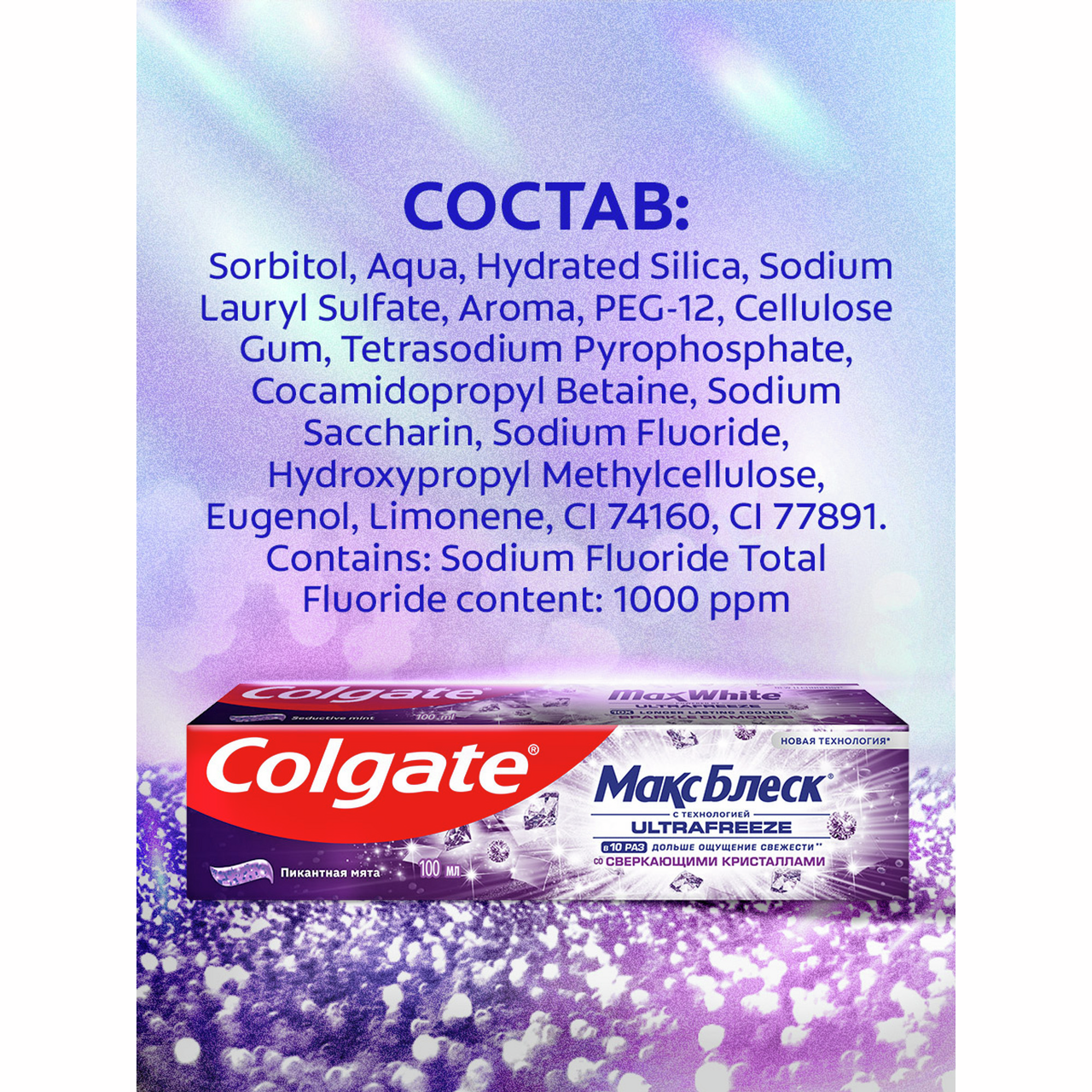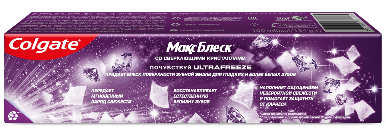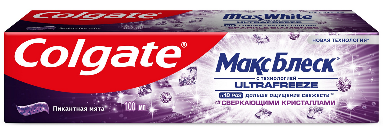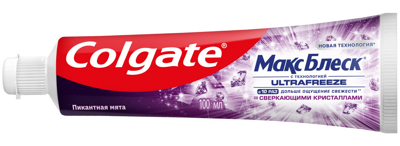 Отбеливающая зубная паста Colgate Макс Блеск Пикантная мята 100мл со сверкающими кристаллами помогает восстановить естественную белизну зубов, а также придает свежесть дыханию для еще большей уверенности в себе.Новая технология Ultrafreeze придает блеск поверхности зубной эмали для гладких и более белых зубов. Передает мгновенный заряд свежести. Восстанавливает естественную белизну зубов. Наполняет ощущением невероятной свежести и помогает защитить от кариеса.