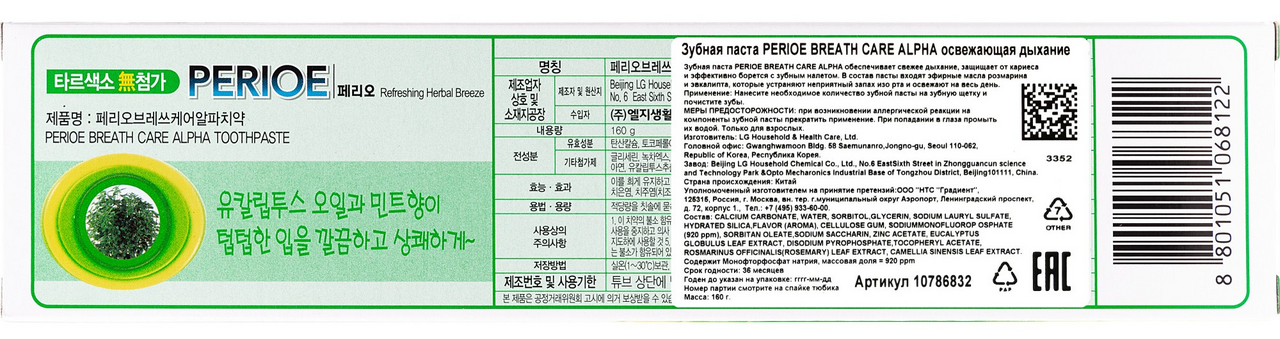 Зубная паста Perioe Breath Care Alpha обеспечивает свежее дыхание, защищает от кариеса и эффективно борется с зубным налетом. В состав пасты входят эфирные масла розмарина и эвкалипта, которые устраняют неприятный запах изо рта и освежают на весь день.