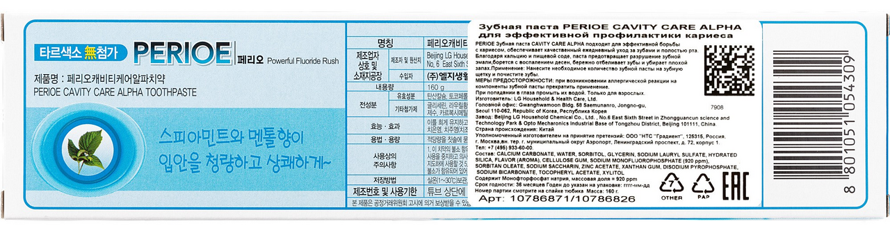 Perioe Зубная паста Cavity Care Alpha подходит для эффективной борьбы с кариесом, обеспечивает качественный ежедневный уход за зубами и полостью рта. Благодаря кальцию и пищевой соде, паста предотвращает разрушение зубной эмали, борется с воспалением десен, бережно отбеливает зубы и убирает плохой запах.