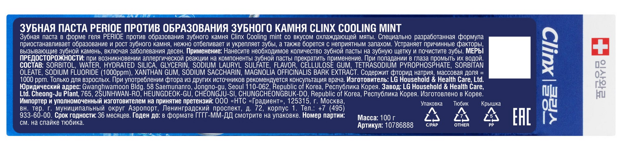 Зубная паста в форме геля Perioe против образования зубного камня Clinx Cooling mint со вкусом охлаждающей мяты. Специально разработанная формула приостанавливает образование и рост зубного камня, нежно отбеливает и укрепляет зубы, а также борется с неприятным запахом. Устраняет причинные факторы, вызывающие зубной камень, включая заболевания десен.