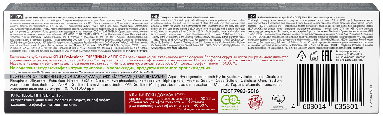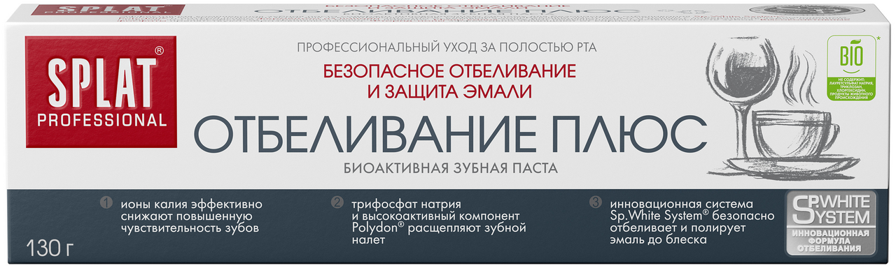 Зубная паста Splat Отбеливание плюс для безопасного отбеливания и защиты эмали, 130г
