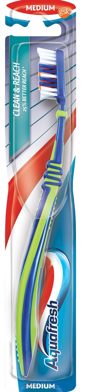 Ежедневный уход за полостью рта важен для здоровья ваших зубов и десен. Зубные пасты и щетки Aquafresh помогут вам позаботиться об очищении ваших зубов и свежести дыхания каждый день! Щетина зубной щетки Aquafresh Clean&Reach обладает средней жесткостью для тщательного очищения зубов. Соединение головки и ручки зубной щетки способствует контролю давления щетки на зубы и предотвращению во��можных повреждений эмали и десен. Разнонаправленные щетинки разной длины предназначены для тщательной чистки межзубных промежутков. Специальное прорезиненное покрытие ручки предотвращают скольжение зубной щетки в руке, что помогает сделать чистку зубов легкой и удобной.Используйте зубную щетку Aquafresh Clean&Reach в комплекте с подходящей вам зубной пастой Aquafresh для комплексного ухода за полостью рта.