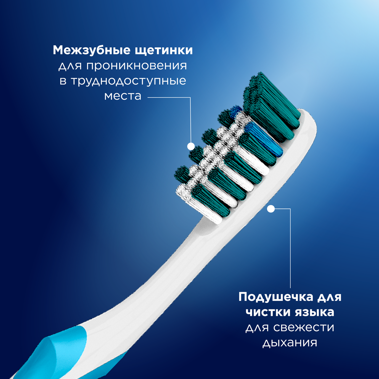 Мануальная зубная щетка Oral-B Complex Глубокая чистка бережно очищает всю полость рта, включая задние зубы и труднодоступные области, обеспечивая эффективное удаление зубного налета. Массажные щетинки мягко массируют и стимулируют десны и помогают очищать зубы вдоль линии десен. Щетинки Power Tip проникают в труднодоступные места между зубами и бережно очищают эмаль. Щетка оснащена подушечкой для чистки языка. Зубная щетка с щетинками средней жесткости. Не забывайте менять свою щетку раз в три месяца. Oral-B – №1 марка, рекомендуемая большинством стоматологов в мире на основании результатов опросов, проведенных с ноября 2019 г. по июнь 2021 г. и подтвержденных как статистически значимые Компанией Radius Illumination, сент. 2021 г.