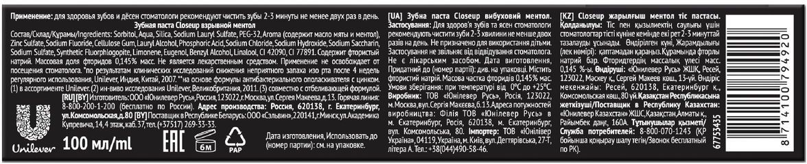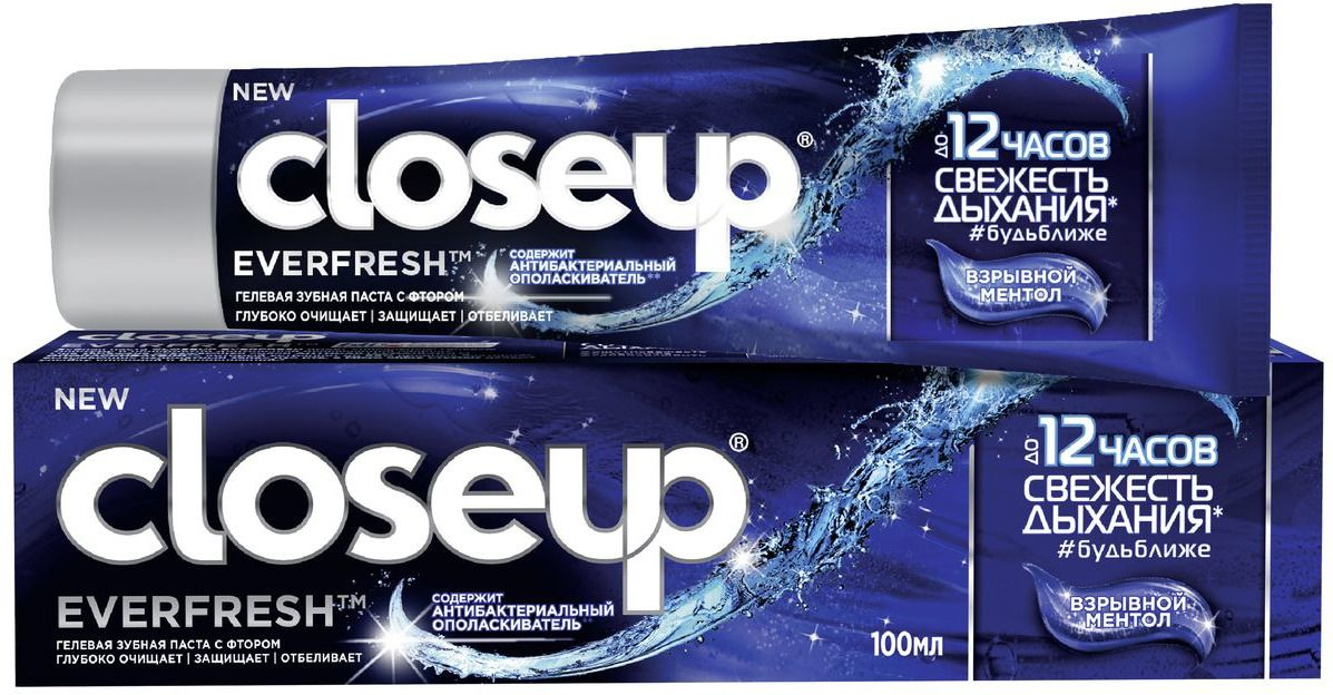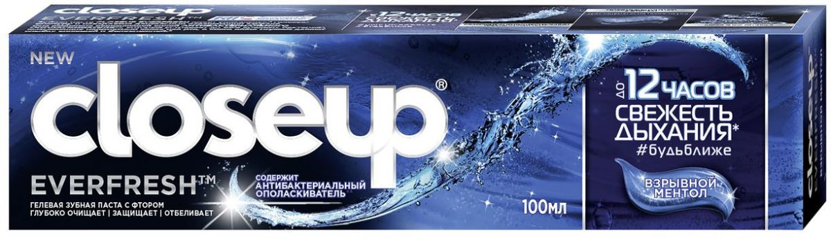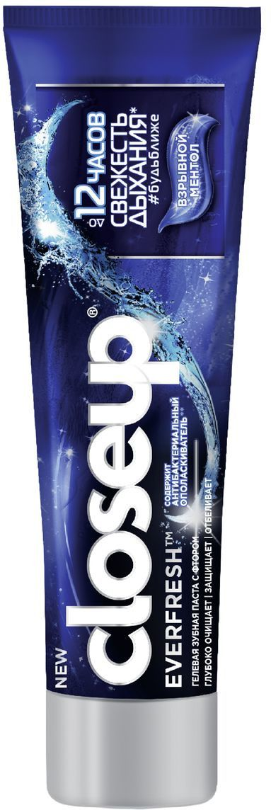 Будьте готовы быть ближе с новой гелевой зубной пастой CLOSEUP EVERFRESH! Зубная паста обеспечивает невероятно длительный освежающий эффект: свежесть дыхания до 12 часов*, чтобы в моменты близости вы всегда чувствовали себя уверенно! Зубная паста заряжена освежающей силой антибактериального ополаскивателя**, который устраняет до 99% вредных бактерий’, вызывающих неприятный запах изо рт��, что позволяет надолго сохранить дыхание свежим. Освежающий эффект зубной пасты подтвержден клиническими исследованиями.Зубная паста CLOSEUP EVERFRESH взрывной ментол имеет уникальную'' гелевую текстуру насыщенного синего цвета с перламутровыми частичками. Зубная паста обладает ярким освежающим вкусом мяты с ментолом.Гелевая зубная паста CLOSEUP EVERFRESH содержит фтор для эффективной защиты от кариеса и защиты всей полости рта. Кроме того, она бережно и тщательно очищает эмаль за счет абразива - диоксида кремния (Silica). Диоксид кремния имеет округлую форму частиц и не травмирует эмаль в процессе чистки зубов, при этом позволяет добиться равномерного удаления налета по всей поверхности зубов. Зубная паста содержит специальные компоненты Micro Shine Crystals, которые способствуют отбеливанию эмали, делая вашу улыбку сияющей и белоснежной’’’.Зубная паста CLOSEUP EVERFRESH взрывной ментол имеет подтверждение FDI (Международная федерация стоматологов) о том, что чистка зубов дважды в день такой зубной пастой Closeup Everfresh, улучшает состояние полости рта. *по результатам клинических исследований снижения неприятного запаха изо рта после 4 недель регулярного использования, Unilever, Индия, Китай, 2007.**на основе формулы антибактериального ополаскивателя с цинком.‘’в ассортименте Unilever.‘ин-виво исследования Unilever, Великобритания, 2011.‘’’совместно с отбеливающей формулой.