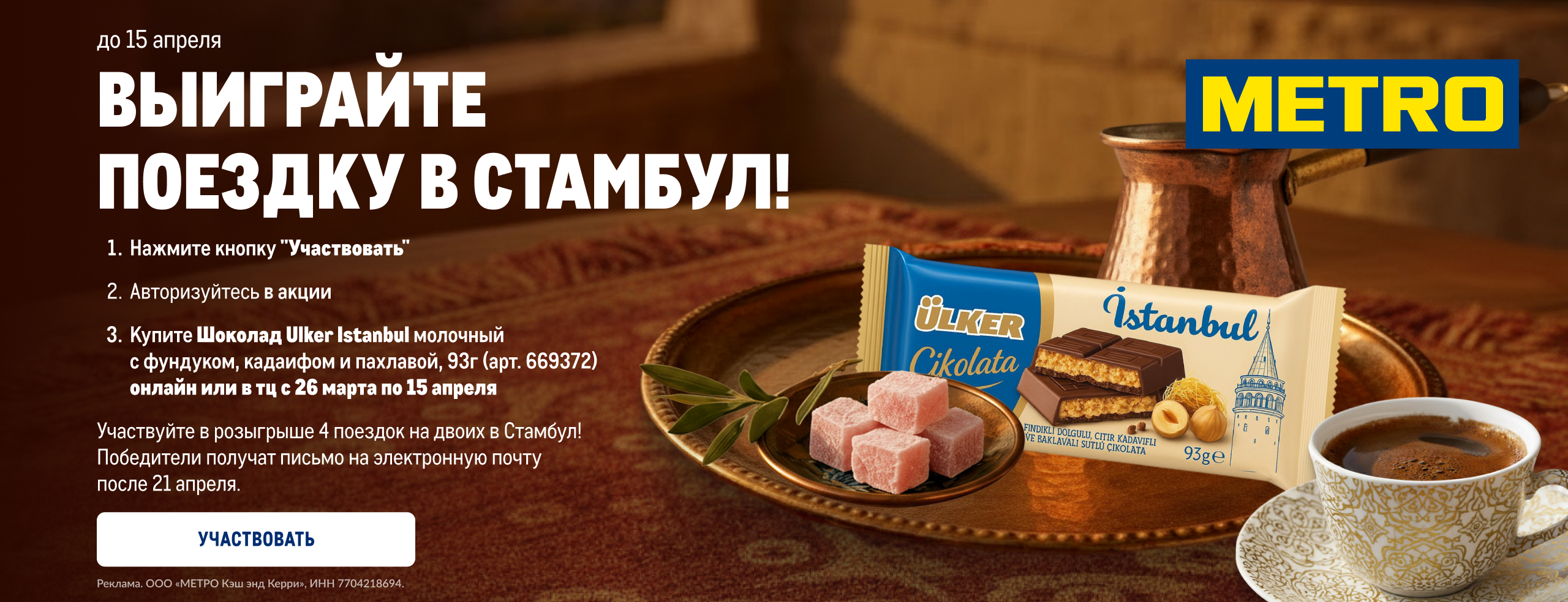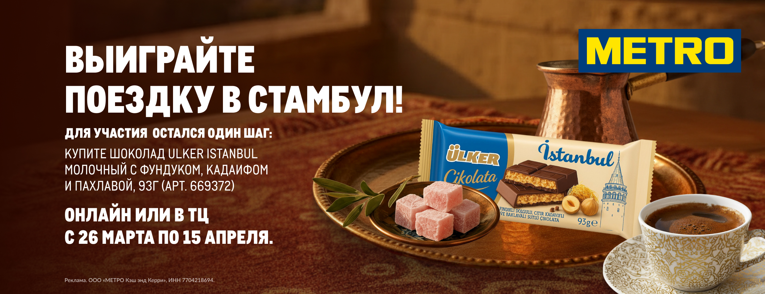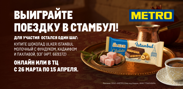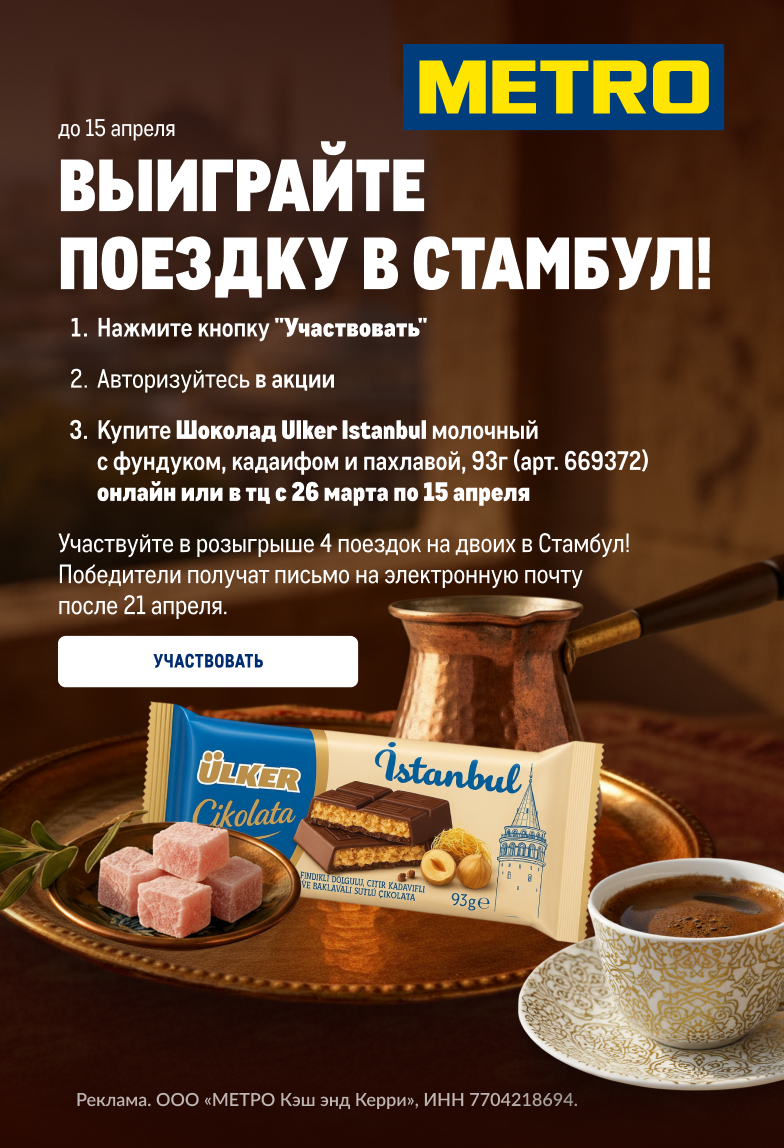 С 26 марта по 20 апреля 2026 года. Акция только для держателей карт гостя METRO (18+), выполнивших все условия и прошедших регистрацию для участия. Есть ограничения. Действует при заказе на сайте online.metro-cc.ru и в ТЦ METRO. Продажу товаров при заказе на сайте осуществляет ООО «ИНСТАМАРТ СЕРВИС», г. Москва, ОГРН: 1187746494980. ООО МЕТРО КЭШ ЭНД КЕРРИ вправе досрочно изменить или завершить акцию по своему усмотрению. Полные Правила: https://online.metro-cc.ru/promo/pravila-provedeniya-konkursa-shokolad-ulker/. Реклама. ООО «МЕТРО Кэш энд Керри». ОГРН 1027700272148